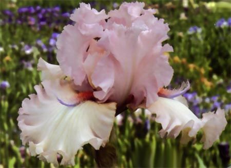 Светло-розовый, очень кружевной с яркой оранжевой бородкой, заканчивающейся фиолетовым рогом.
