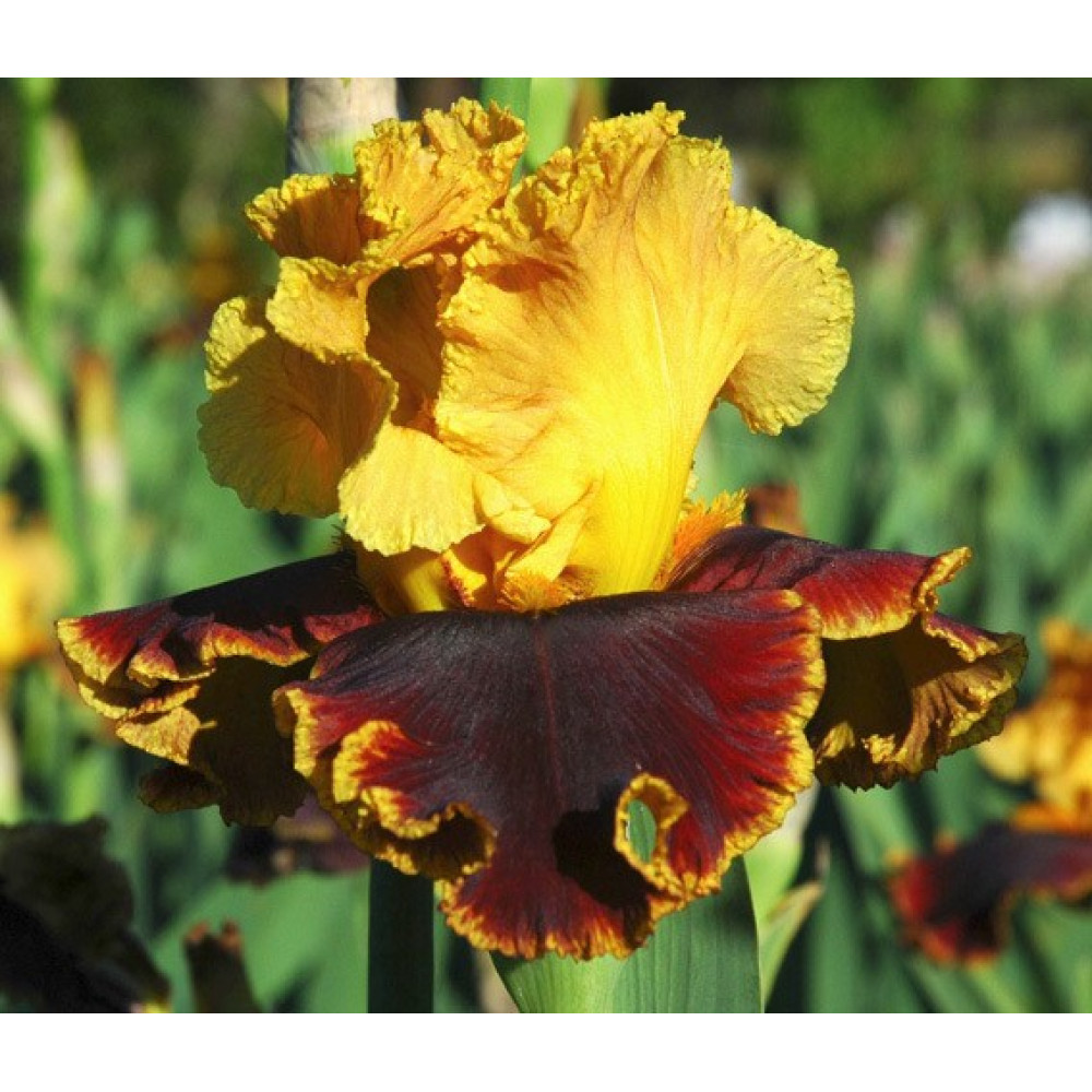 Ярко-золотые стандарты и бархатистые коричнево-красные фолы с яркой золотой каймой и золотыми лучами у золотистой бородки.