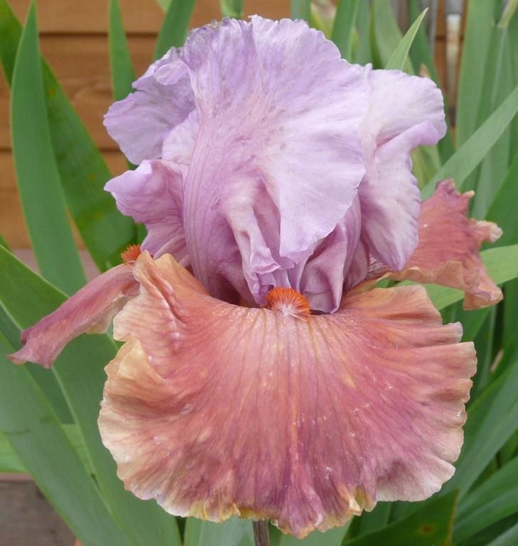 Фолы медно-розовые с сиреневым бликом на не большой кремовой области под ярко-мандариновыми бородками, с тонкой сиреневой кромкой.