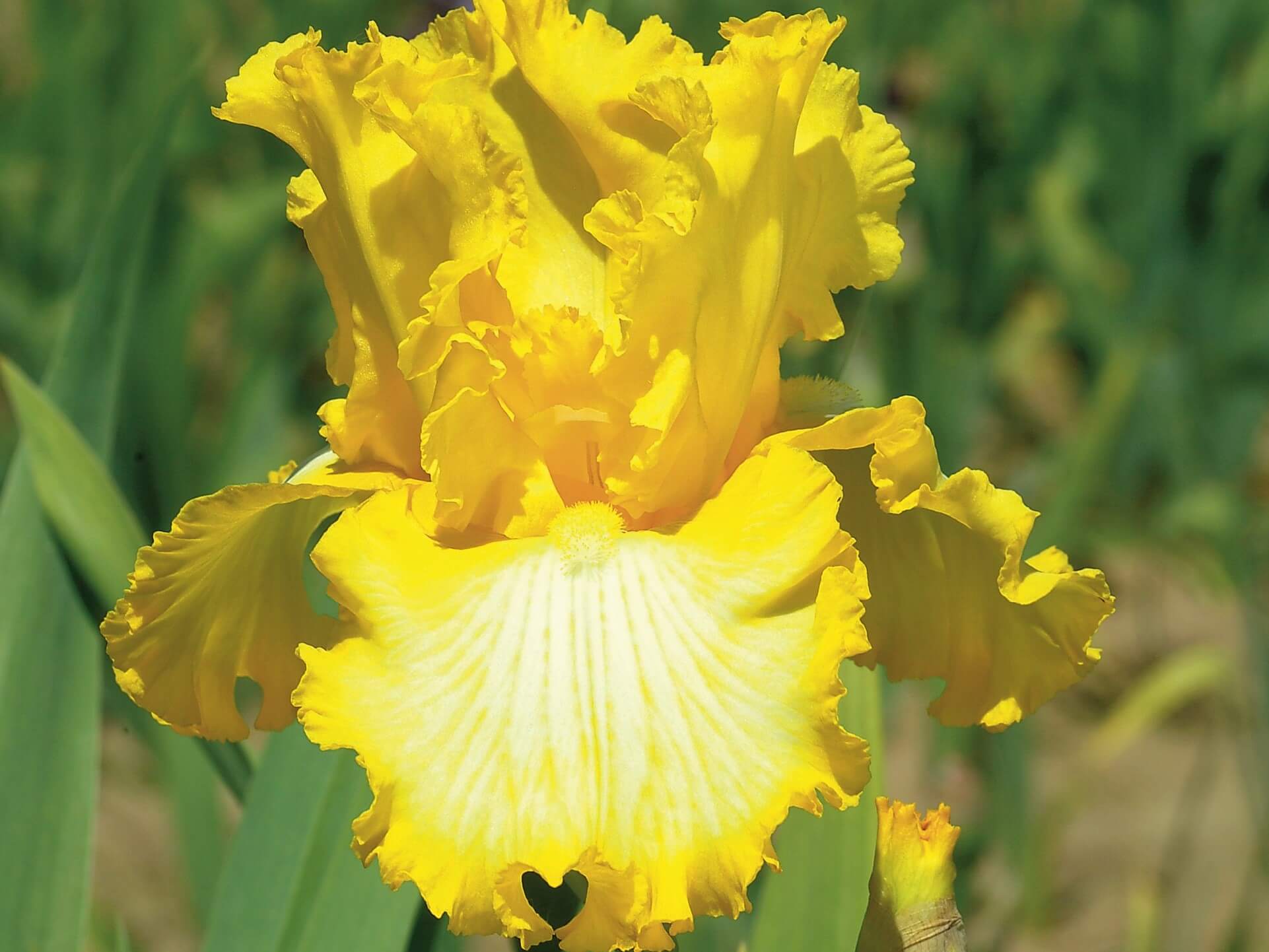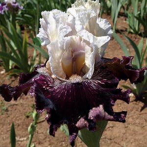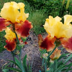 Стандарты-блестящие ярко-желтые, фолы — белые с желто-золотой накладкой на плечах, краях, прожилках. Бородки золотые. Ветвистый и сильный. Высота цветоноса — 102 см. Замечательная форма. Красавец!!!
