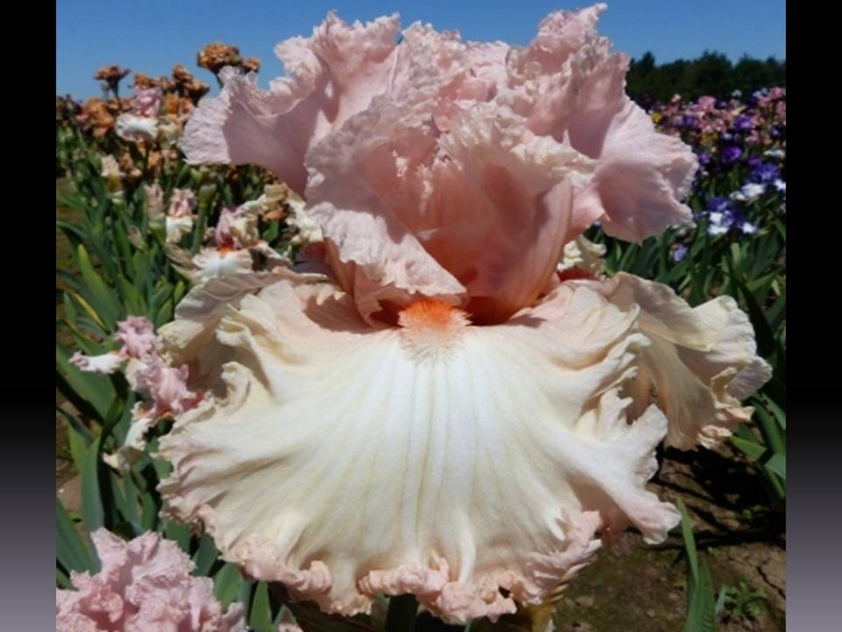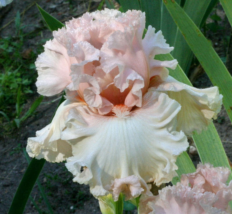 Нежно розовый с более темными сильно гофрированными и кружевными стандартами и кремово-белыми с розовинкой к краям фолов. Бородка белая.