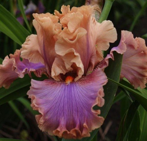 Медово-коричневые стандарты и фолы – смесь лавандово-медово-коричневого с темно-лавандовым жилкованием оторочены лавандово-загарной каймой. Бородки – оранжевые. Прекрасно гофрированный красавец!