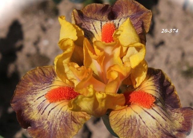 Поздний ирис. Насыщенно желтые стандарты и светло желтые фолы с замысловатым рисунком пликаты и яркой мандариновой бородкой. На фолах есть темные жилки и светлая кайма.