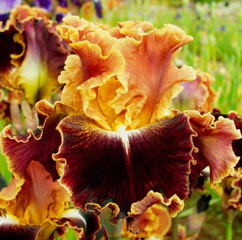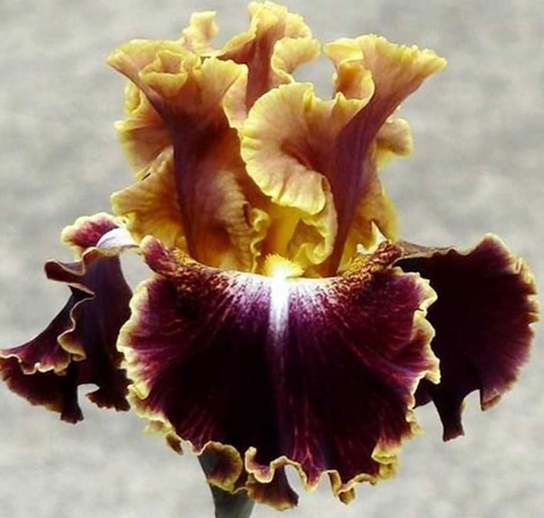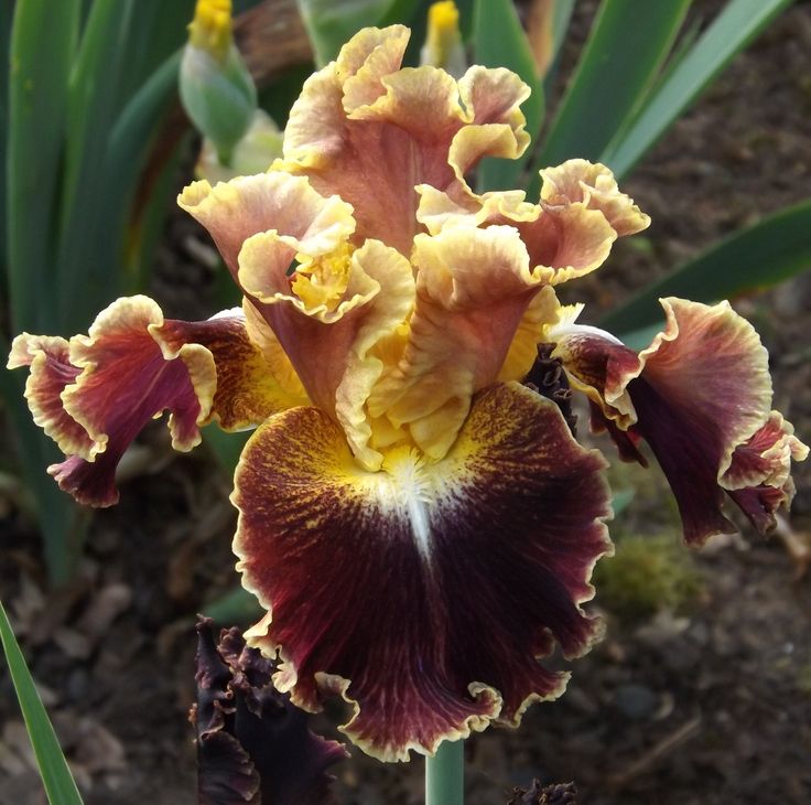 Фолы — бархатные, рубиново-красные, в золотистом обрамлении, с белой вспышкой у основания и желтыми лучиками на плечиках.